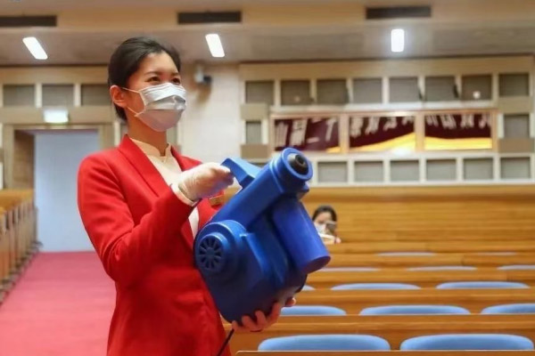 打掃完房間后,服務人員使用手動噴壺對空氣和異味源進行噴灑除味作業.